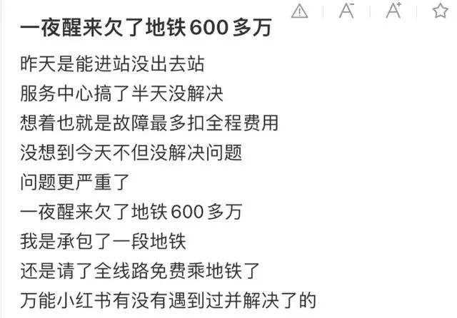 但隨后想起前一天的情況后,該網(wǎng)友也是意識到了問題,這是地鐵的收費(fèi)的系統(tǒng)出現(xiàn)了問題。此前新聞也爆出過此類問題,刷公交,地鐵等不斷扣費(fèi)的情況。于是不再慌張,并把情況發(fā)到了小紅書之上尋求幫助。而自己也前往地鐵部門進(jìn)行協(xié)商。