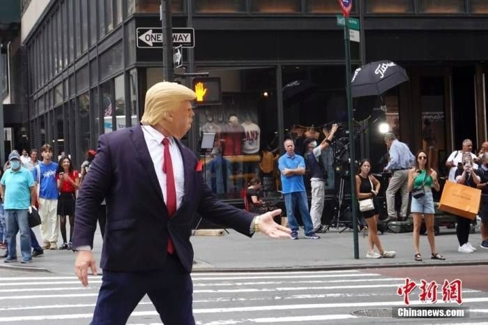 資料圖:當(dāng)?shù)貢r間8月10日,一名戴著面具的示威者在美國紐約特朗普大廈外模仿美國前總統(tǒng)特朗普。近兩日,特朗普大廈前示威者、記者、圍觀民眾等人流聚集。 中新社記者 廖攀 攝