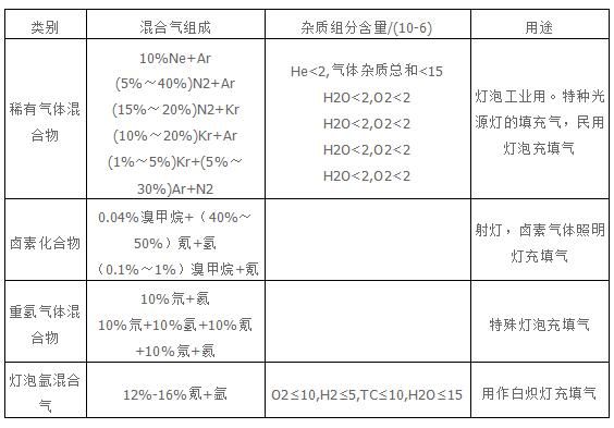 電光源混合氣主要用作白熾燈、特種光源燈(如紅外線燈、強(qiáng)烈溢光燈、熒光燈、發(fā)光信號、太陽燈、臭氧燈、光化學(xué)燈、滅菌燈、紫外線燈、輝光燈、鋯弧...